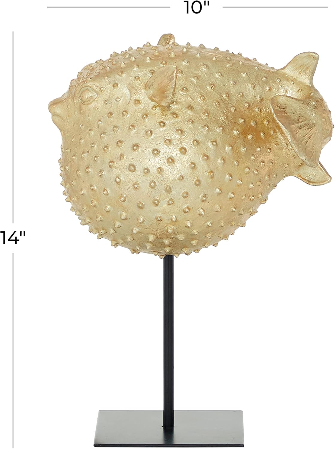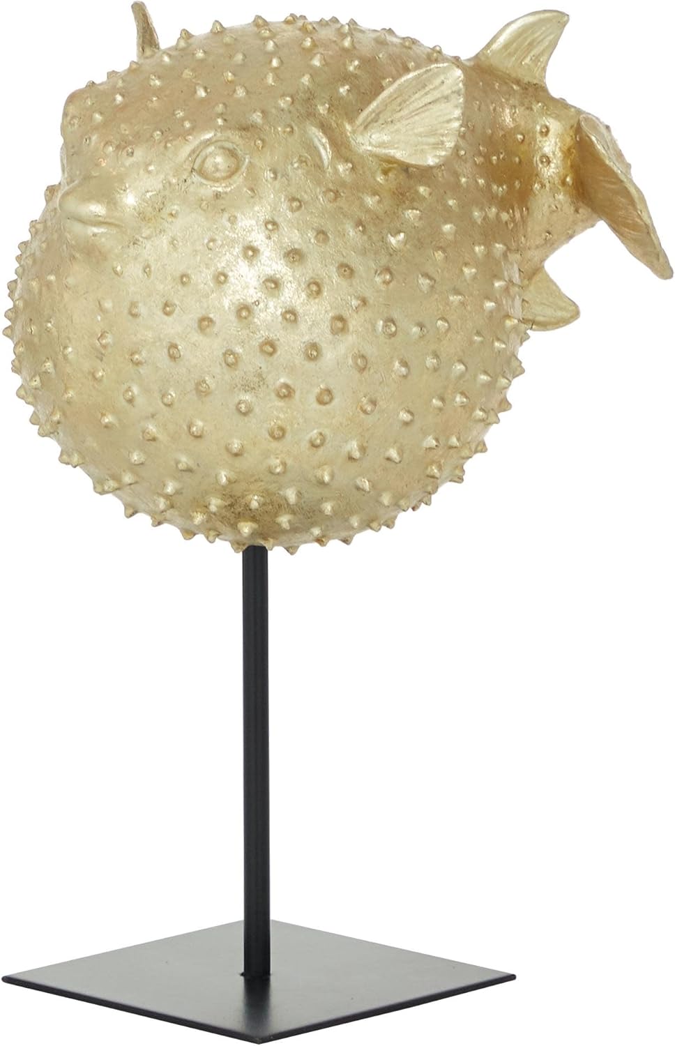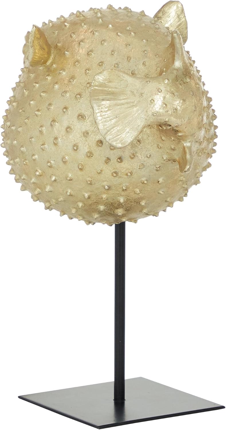 This Deco 79 gold blowfish sculpture is a true work of art, expertly crafted to embody the serene beauty of the ocean. With its intricate design and eye-catching texture, it brings a touch of nature and sophistication to your interior space. The premium gold polyresin finish glimmers beautifully under any light, while the durable black metal stand adds stability and a modern edge to its aesthetic. Whether you're enhancing your living room, hallway, or office, this 10" x 7" x 14" gold blowfish decor statue will make a striking visual impact. Its unique spiked design adds bold artistic flair to any room, creating a focal point that's both contemporary and timeless. The compact size allows for easy placement on tabletops, mantles, or even entryways, making it a versatile addition to your decor collection. This blowfish decorative figurine is more than just a piece of artâit's an expression of style and personality. It adds a modern, coastal vibe and a sense of calm to your home, making it a perfect accent for anyone who loves the sea. The detailed craftsmanship ensures that it remains a cherished centerpiece for years to come. This gold blowfish sculpture is a standout piece for anyone who appreciates the beauty of the ocean and the sophistication of modern design. It's more than just a decor statueâit's a tribute to nature and style, designed to elevate your space with its unique, coastal appeal. Enhance your environment with this elegant gold blowfish sculpture. It's a perfect blend of art, style, and function, offering lasting beauty and a unique touch to your home or office. This gold blowfish sculpture, home decor statue, and coastal decorative accent are designed to add a touch of art and sophistication to any room. The polyresin home decor and blowfish decorative figurine blend modern elegance with nature-inspired charm, making it an ideal statement piece for your living space.Deco 79 Gold Blowfish Sculpture â A Statement of Coastal Elegance