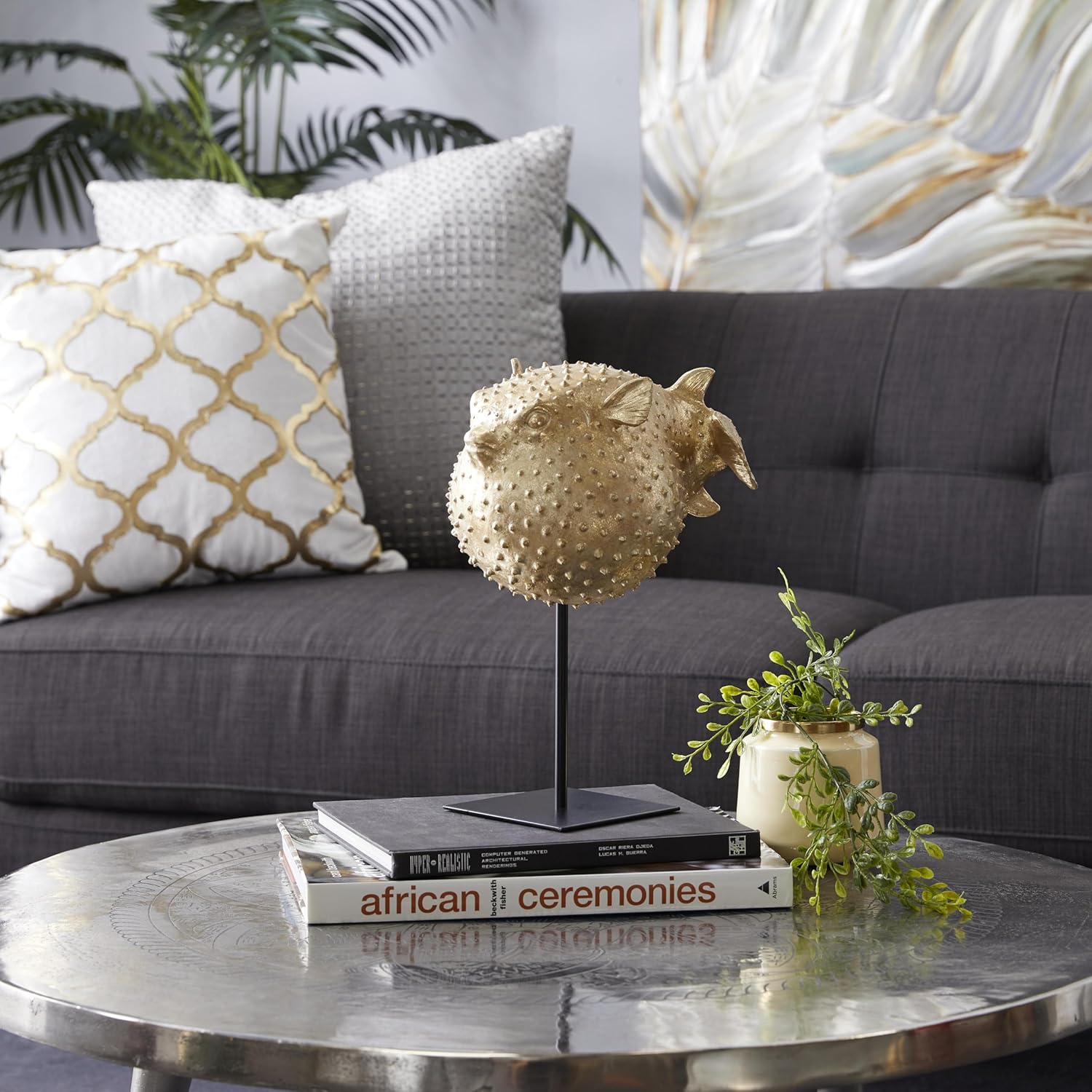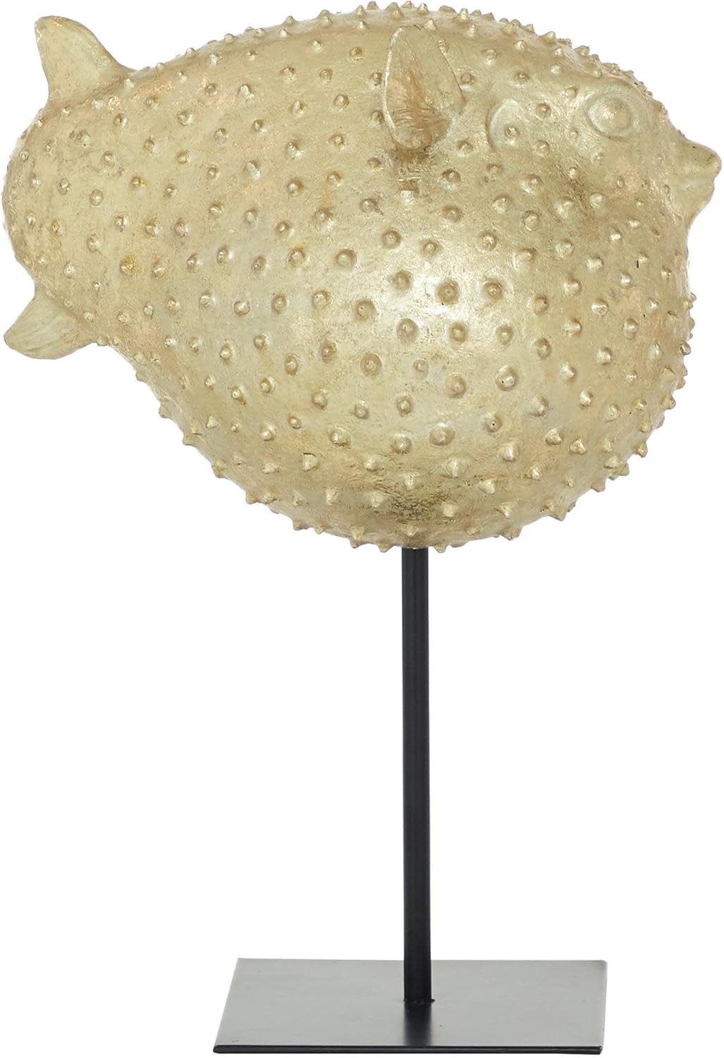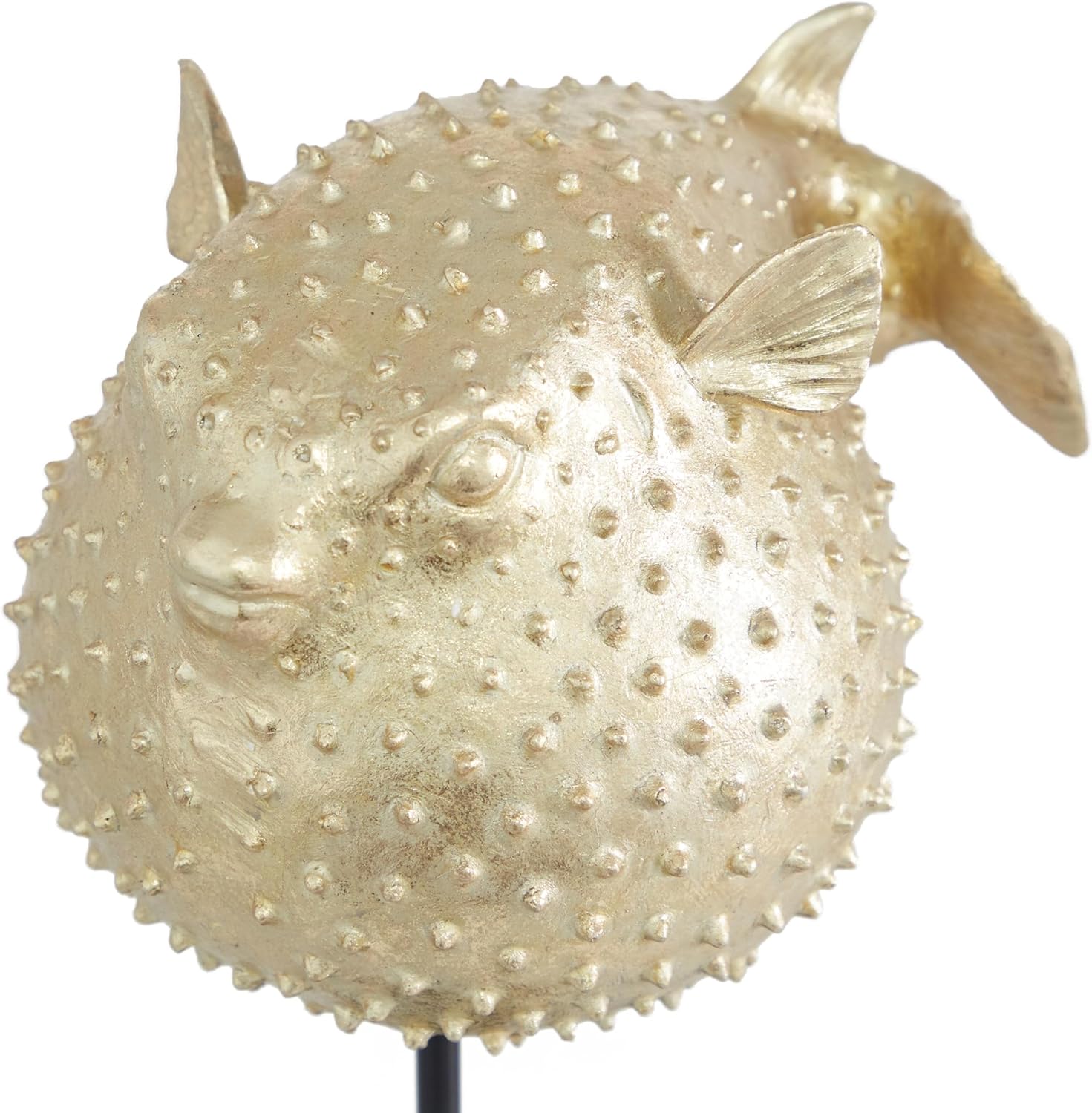 This Deco 79 gold blowfish sculpture is a true work of art, expertly crafted to embody the serene beauty of the ocean. With its intricate design and eye-catching texture, it brings a touch of nature and sophistication to your interior space. The premium gold polyresin finish glimmers beautifully under any light, while the durable black metal stand adds stability and a modern edge to its aesthetic. Whether you're enhancing your living room, hallway, or office, this 10" x 7" x 14" gold blowfish decor statue will make a striking visual impact. Its unique spiked design adds bold artistic flair to any room, creating a focal point that's both contemporary and timeless. The compact size allows for easy placement on tabletops, mantles, or even entryways, making it a versatile addition to your decor collection. This blowfish decorative figurine is more than just a piece of artâit's an expression of style and personality. It adds a modern, coastal vibe and a sense of calm to your home, making it a perfect accent for anyone who loves the sea. The detailed craftsmanship ensures that it remains a cherished centerpiece for years to come. This gold blowfish sculpture is a standout piece for anyone who appreciates the beauty of the ocean and the sophistication of modern design. It's more than just a decor statueâit's a tribute to nature and style, designed to elevate your space with its unique, coastal appeal. Enhance your environment with this elegant gold blowfish sculpture. It's a perfect blend of art, style, and function, offering lasting beauty and a unique touch to your home or office. This gold blowfish sculpture, home decor statue, and coastal decorative accent are designed to add a touch of art and sophistication to any room. The polyresin home decor and blowfish decorative figurine blend modern elegance with nature-inspired charm, making it an ideal statement piece for your living space.Deco 79 Gold Blowfish Sculpture â A Statement of Coastal Elegance
